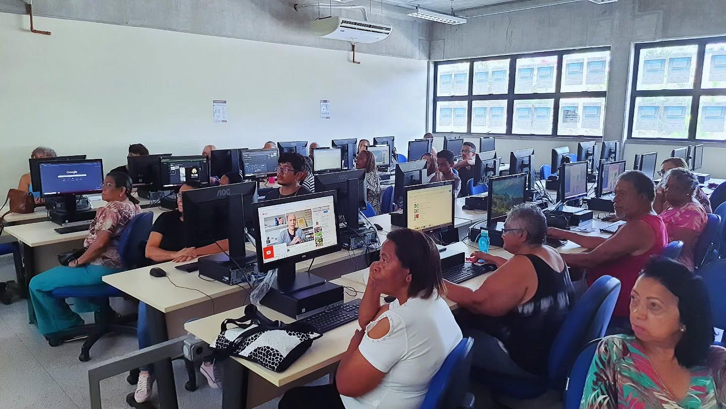 Hoje tivemos a terceira aula do nosso curso de informática para a melhor idade! 👴👵 Nossos alunos reforçaram os aprendizados sobre o teclado, praticaram digitação e navegaram na Internet.