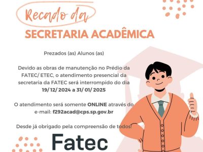 Prezados (as) Alunos (as) Devido as obras de manutenção no Prédio da FATEC/ETEC, o atendimento presencial da secretaria da FATEC será interrompido do dia 19/12/2024 a 31/01/2025 O atendimento será somente ONLINE através do e-mail: […]